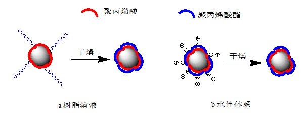 HT A20分子中的錨固部分由(甲基)丙烯酸、磷酸的均聚物或共聚物組成,通過和鈦白粉間的吸引力(配位作用、共價鍵)吸附在粒子表面,將粒子隔離開來。和樹脂相容的穩(wěn)定部分由丙烯酸酯、甲氧基聚丙二醇丙烯酸酯無規(guī)共聚物組成,賦予表面改性后的鈦白粉粒子良好的再分散性,并且能穩(wěn)定均勻分散在樹脂溶液和溶劑揮發(fā)后的樹脂中。在體系干燥過程中以及干燥后,和樹脂相容的部分能包覆在鈦白粉粒子表面,防止粒子聚集,使得鈦白粉粒子在樹脂中能均勻分散。圖2表示改性劑HT A20處理鈦白粉粒子后,HT A20在粒子表面的形態(tài)。圖2a表示在樹脂溶液或溶劑中,干燥前,改性劑的錨固部分和鈦白粉粒子間通過共價鍵、配位鍵結(jié)合在粒子表面上,聚丙烯酸酯部分充分伸展,通過空間位阻作用穩(wěn)定粒子;干燥后,聚丙烯酸酯部分包覆在粒子上或和樹脂基體互相滲透。圖2b表示在水性體系中,干燥前,改性劑的聚丙烯酸錨固部分和鈦白粉粒子間通過共價鍵、配位鍵結(jié)合在粒子表面上,依靠靜電斥力穩(wěn)定粒子;干燥后,聚丙烯酸酯部分包覆在粒子上或和樹脂互相滲透??梢?,雙親型嵌段聚合物改性劑HT A20對鈦白粉進行有機表面處理后,在有機溶劑體系和水性體系中,都能提高鈦白粉在介質(zhì)中的分散穩(wěn)定性并改善鈦白粉和樹脂的相容性。